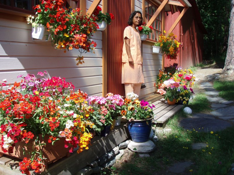In 1990 she came as a representative from the Paramananda Mission to Shantibu in Alvdal, Norway to help with establishing the Mt.Tron University of Peace. She quickly transformed an area of barren mountain forest land at an altitude of 700 metres into a unique rich and colourful flower garden.  Tripti Ma has been a Norwegian citizen since 2000 and holds an Indian "green card". From India she holds a Masters Degree in Philosophy, and in Norway she has passed Norwegian language exams and educated herself in child and youth care.