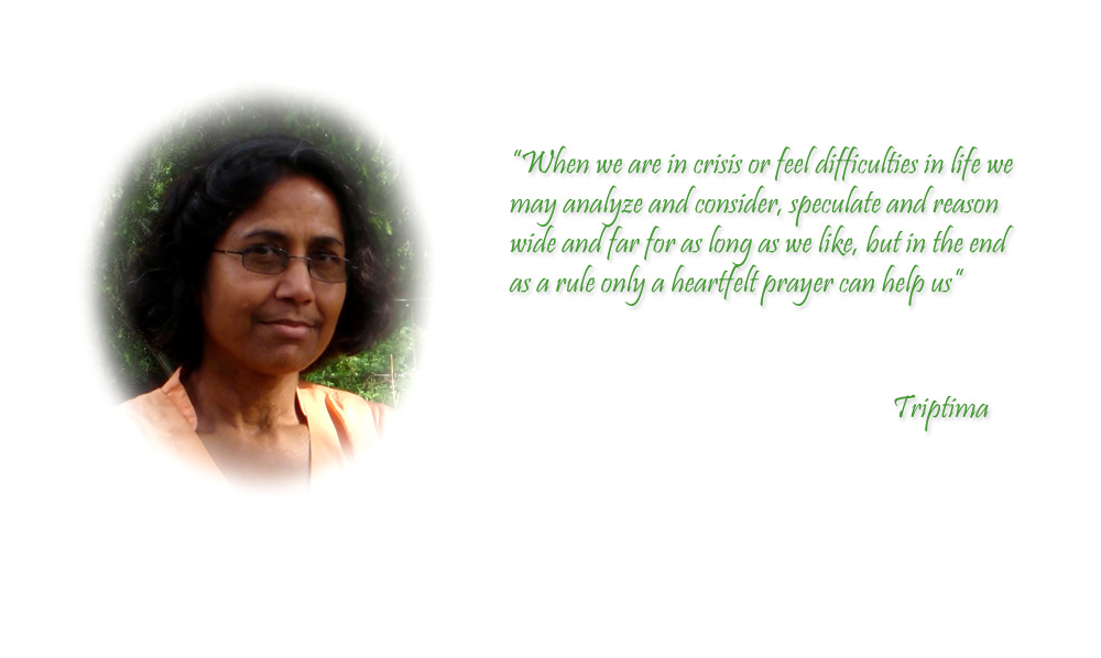 From her childhood Tripti was a Truth-seeker and her parents would always find her in one of the neighbouring temples when she didn’t return home after dark. While working as a teacher in Calcutta, she came to Swami Paramananda in 1979 at the very beginning of the Paramananda Mission in Burdwan District of West Bengal and was the first woman at the centre. After that she spent two years in meditation in the Himalayas and one year isolated in intense meditation in the Mission’s main centre close to the village of Banagram, which, by the blessings of Paramananda, she completed successfully. She was active in this centre for a number of years working with orphan children. On account of her great ability to gather and unite people, and because of her good organizational abilities, Swami Paramananda asked her to set up and lead a centre for women in Karimpur, Nadia District, West Bengal and she was busy with this in the two years leading up to her departure from India.